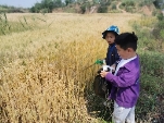 刘芸珲:你们看,对面的小山坡上有一个老婆婆在干活诶。等一下我们去和她打招呼吧,我们要做个有礼貌的好孩子。