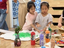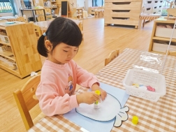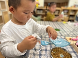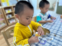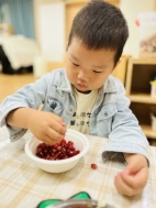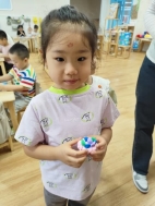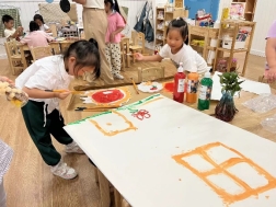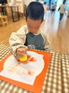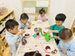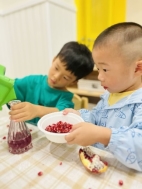 看!剥开鲜美的石榴,我们用捶、拉、挤等多种方式榨取到好多石榴汁呢,最有趣的老师将石榴汁点缀上孩子们的朱砂“痣”,寓意着启智增慧。