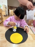 孩子们的精彩讲述让这个美丽的传说故事变“活”了起来,瞧!他们合作做了大月亮给嫦娥居住,还做了祭拜嫦娥的月饼,舞台剧《嫦娥奔月》就这样慢慢呈现了出来。