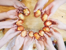小朋友们精心挑选自己喜欢的花朵和叶子,小心翼翼的覆盖在鸡蛋上,外面再包上一层纱布,用线扎紧,最后放入煮有洋葱皮的锅进行小火慢煮。
