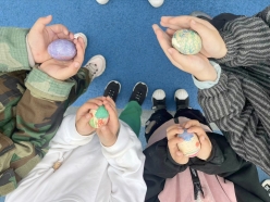 绘彩蛋是中国的传统习俗,象征圆圆满满。宝贝们小心翼翼地拿着手中的鸡蛋,用五彩画笔画上了美丽的花纹、线条及各种图案,瞬时间,独一无二的“彩蛋”呈现在了我们眼前,宝贝们在绘蛋中收获了快乐,体验了民俗乐趣。