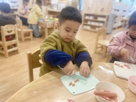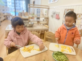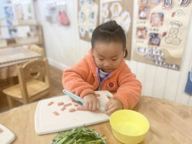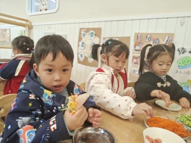 师:"我们每一样蔬菜少放一点,放太多就卷不起来了哦。"