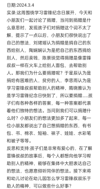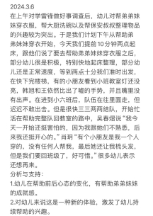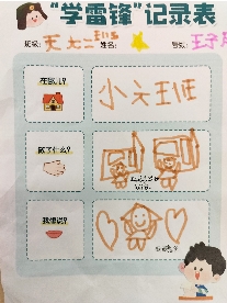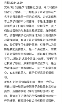 瞧!大班的孩子们正聚精会神地听着雷锋叔叔的故事,眼睛里闪烁着对英雄的敬仰之光,他们深刻体会到雷锋无私奉献、助人为乐的精神。大班组的老师们也用日观察的方式记录着孩子们关于雷锋故事的点点滴滴,支持着孩子。