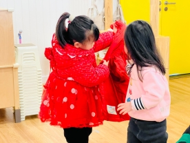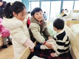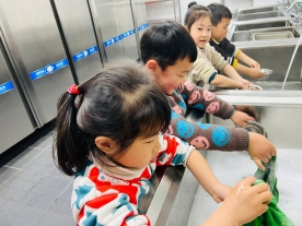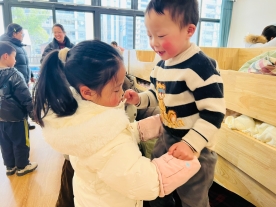 瞧!大二班的小朋友们正非常热情的为小班的弟弟妹妹们服务呢。