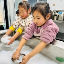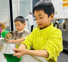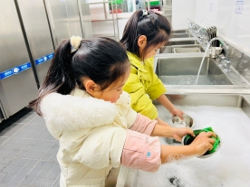 孩子们用心地帮大厨洗碗,脸上挂满了幸福的笑容。